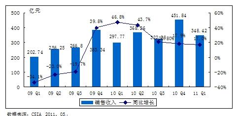 2009Q1—201Q1中國集成電路產(chǎn)業(yè)銷(xiāo)售額規模及增長(cháng)