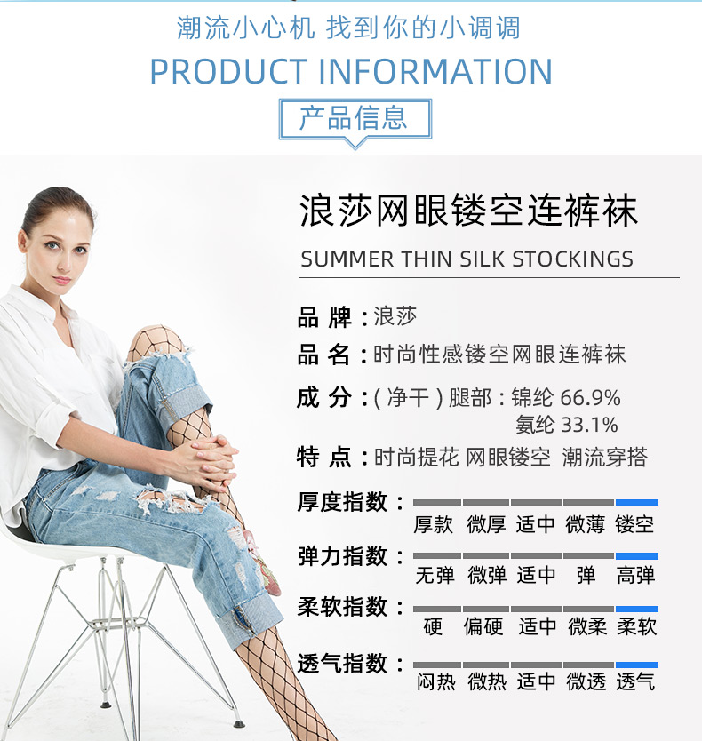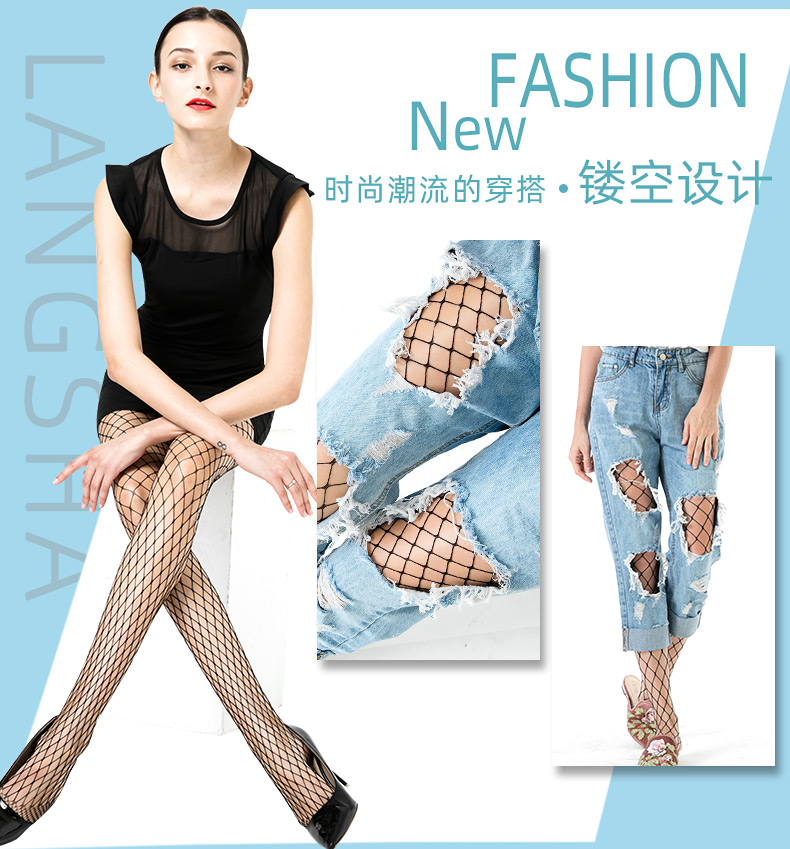浪莎絲襪春夏超薄性感黑絲襪子女 搭配破洞牛仔褲漁網(wǎng)襪連褲襪